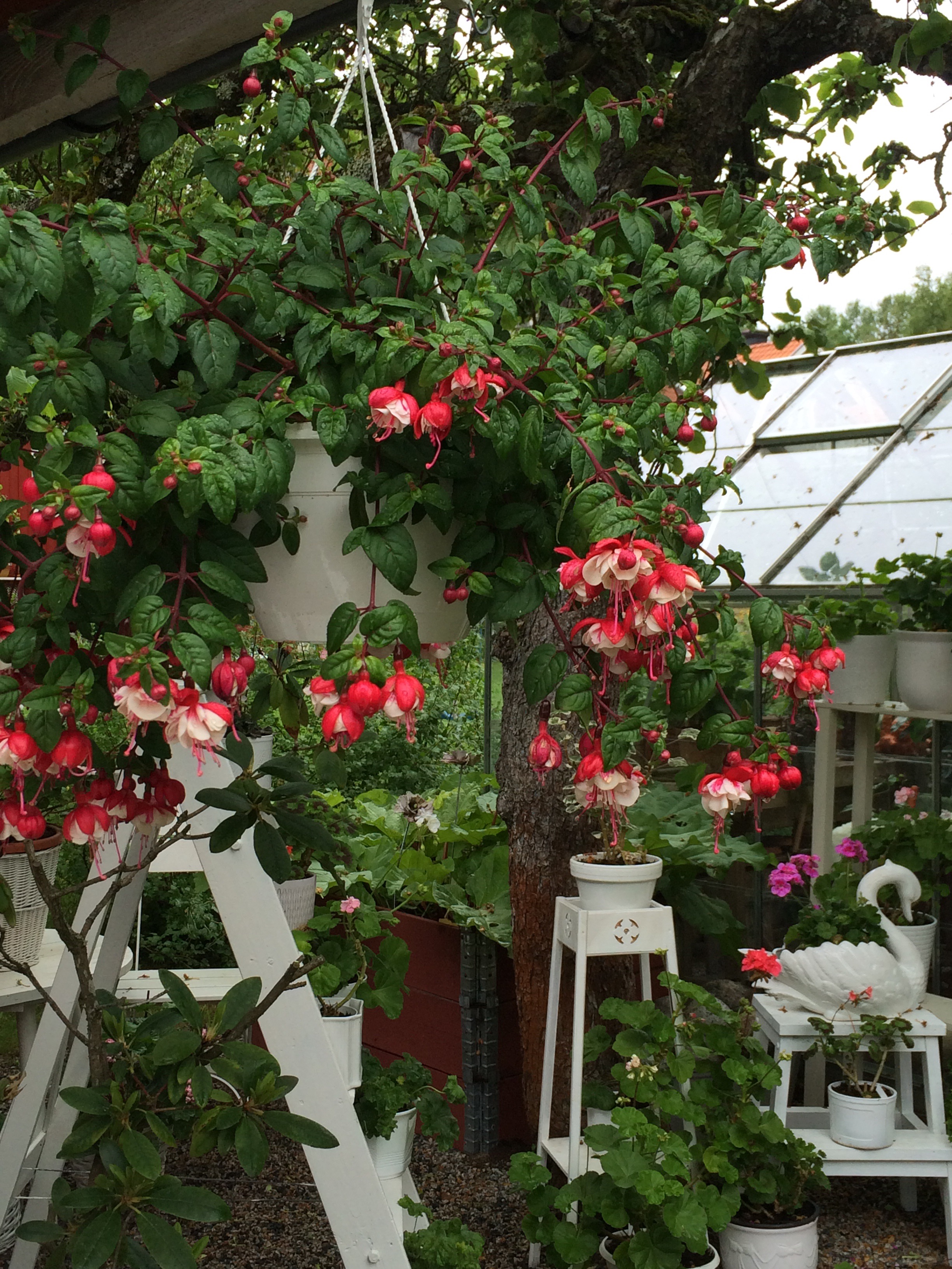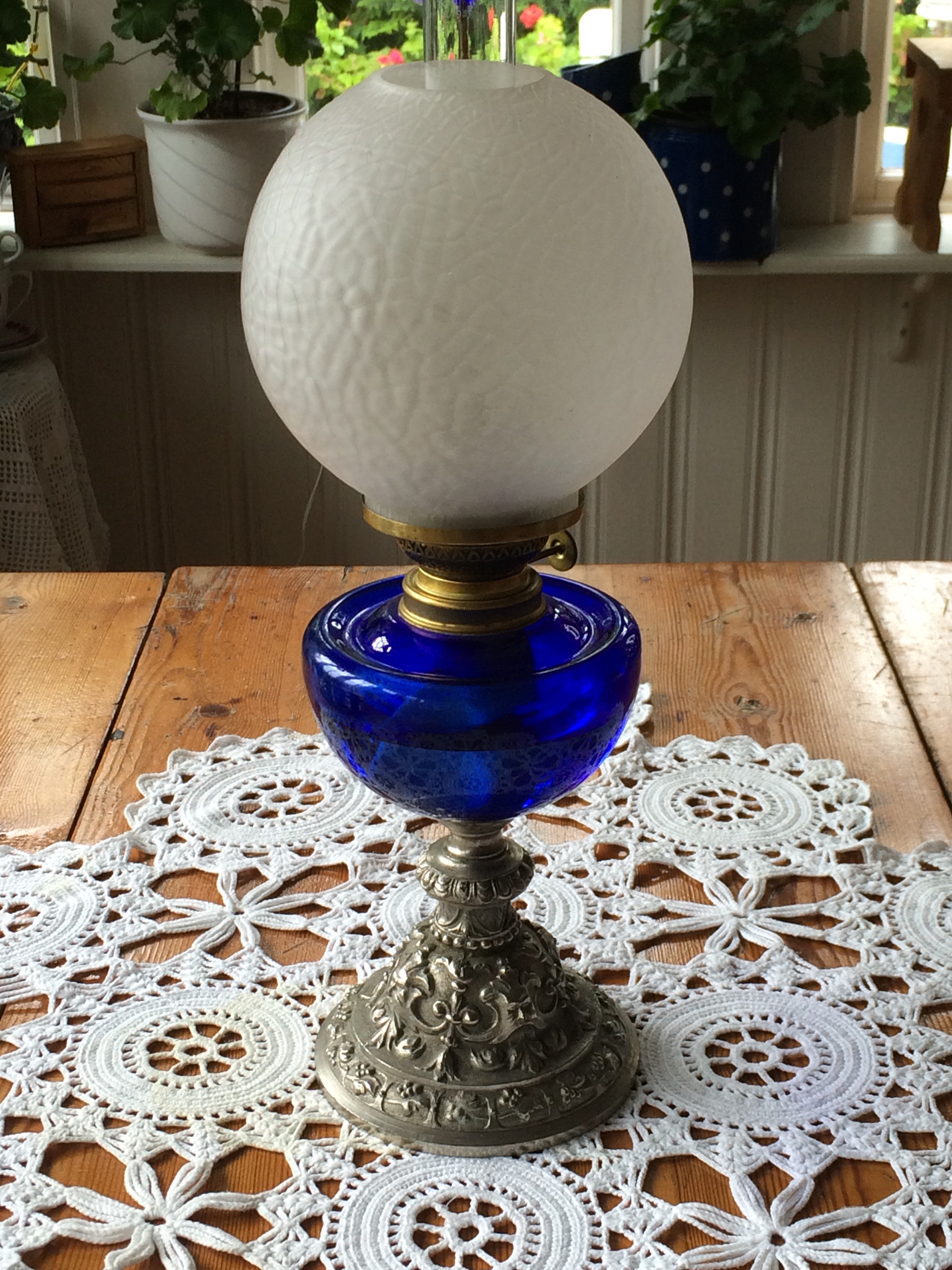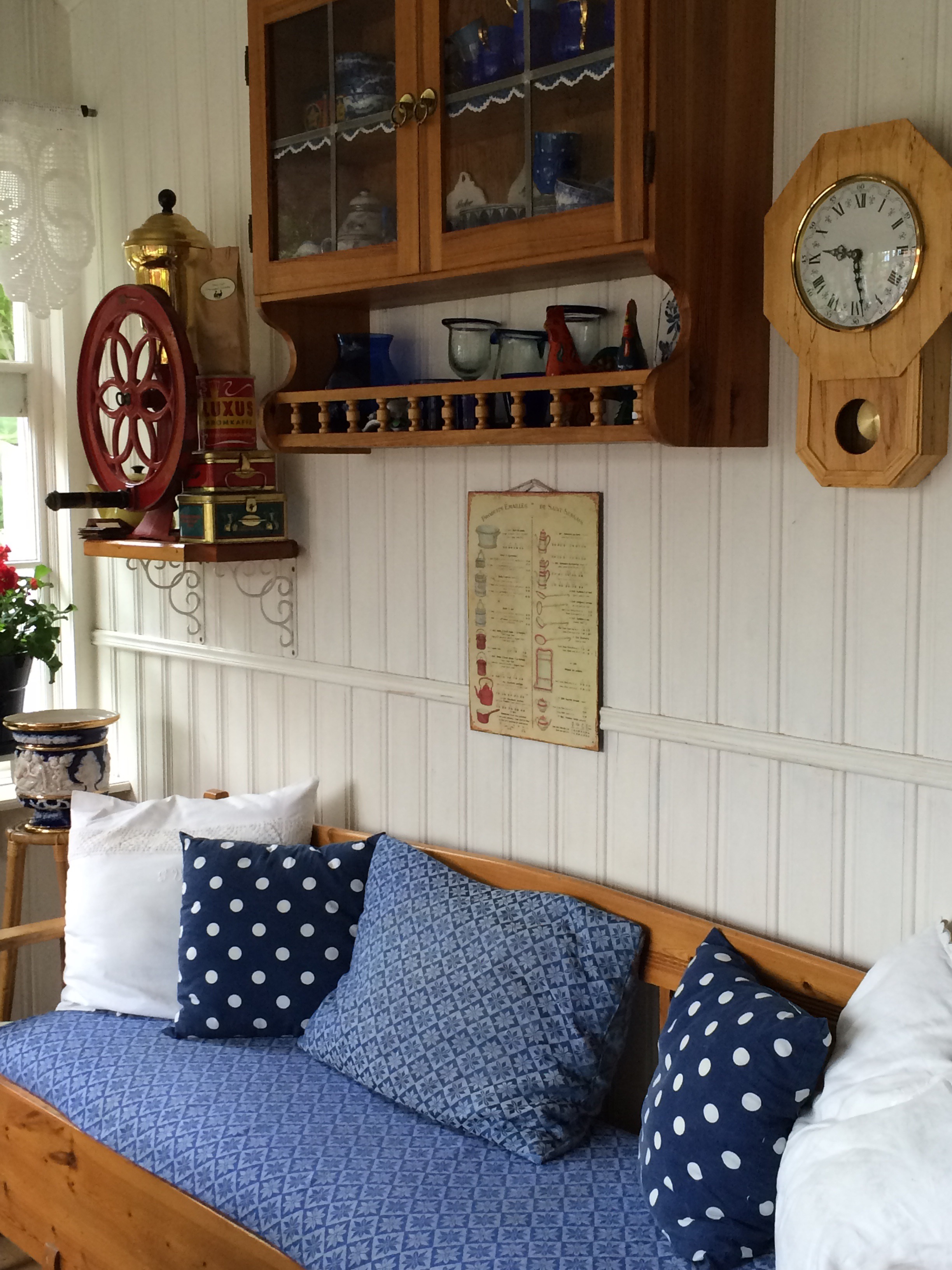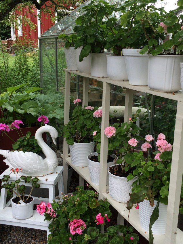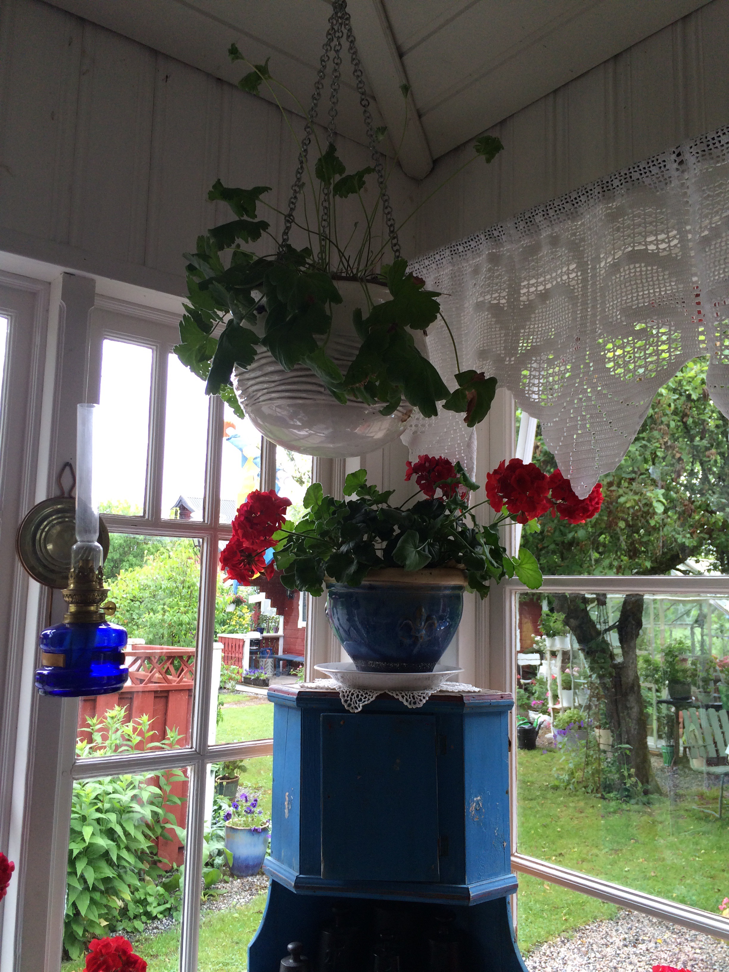 Blått o vitt med röda pelargoner är temat på vår glasverandan. dom långa ljusen i kronan är inköpta av Annika på Dunderbo ljus o hantverk,verkligen värt ett besök,med hembakt fika o deras trädgård..