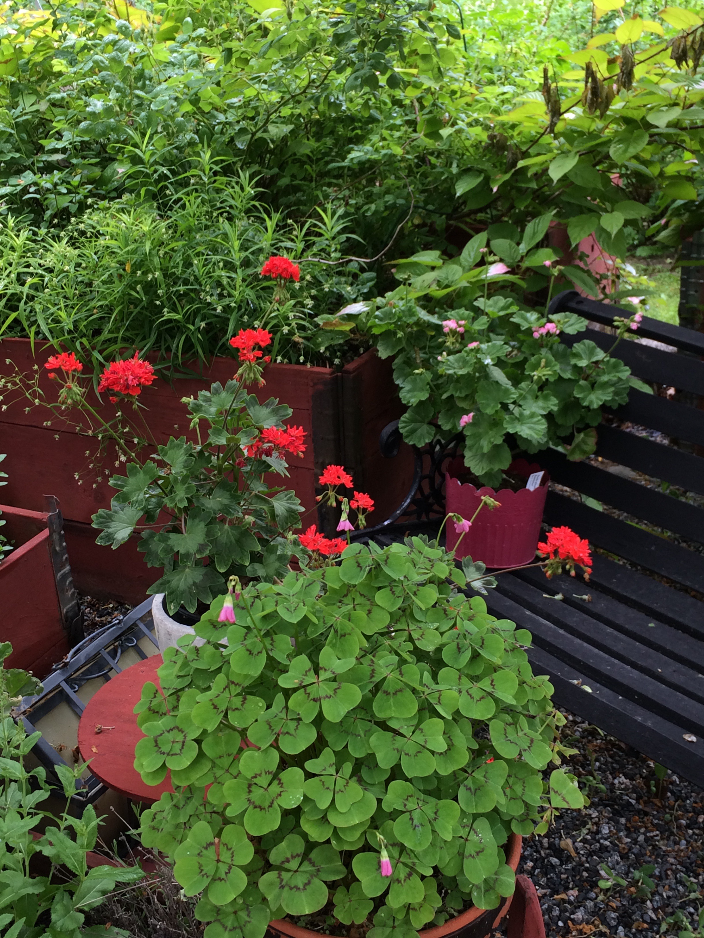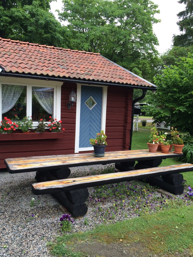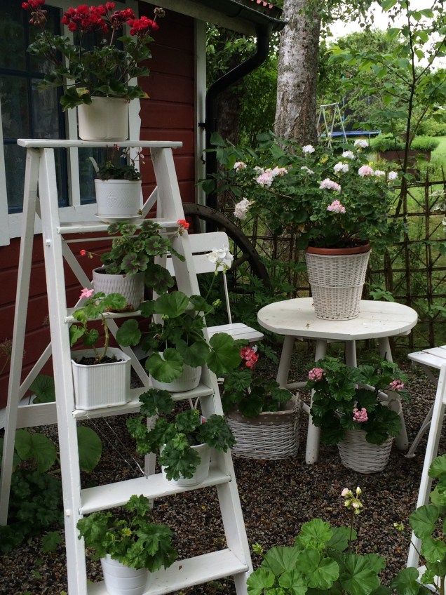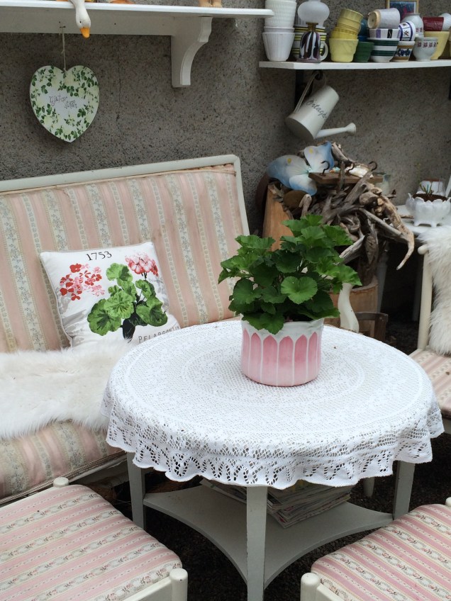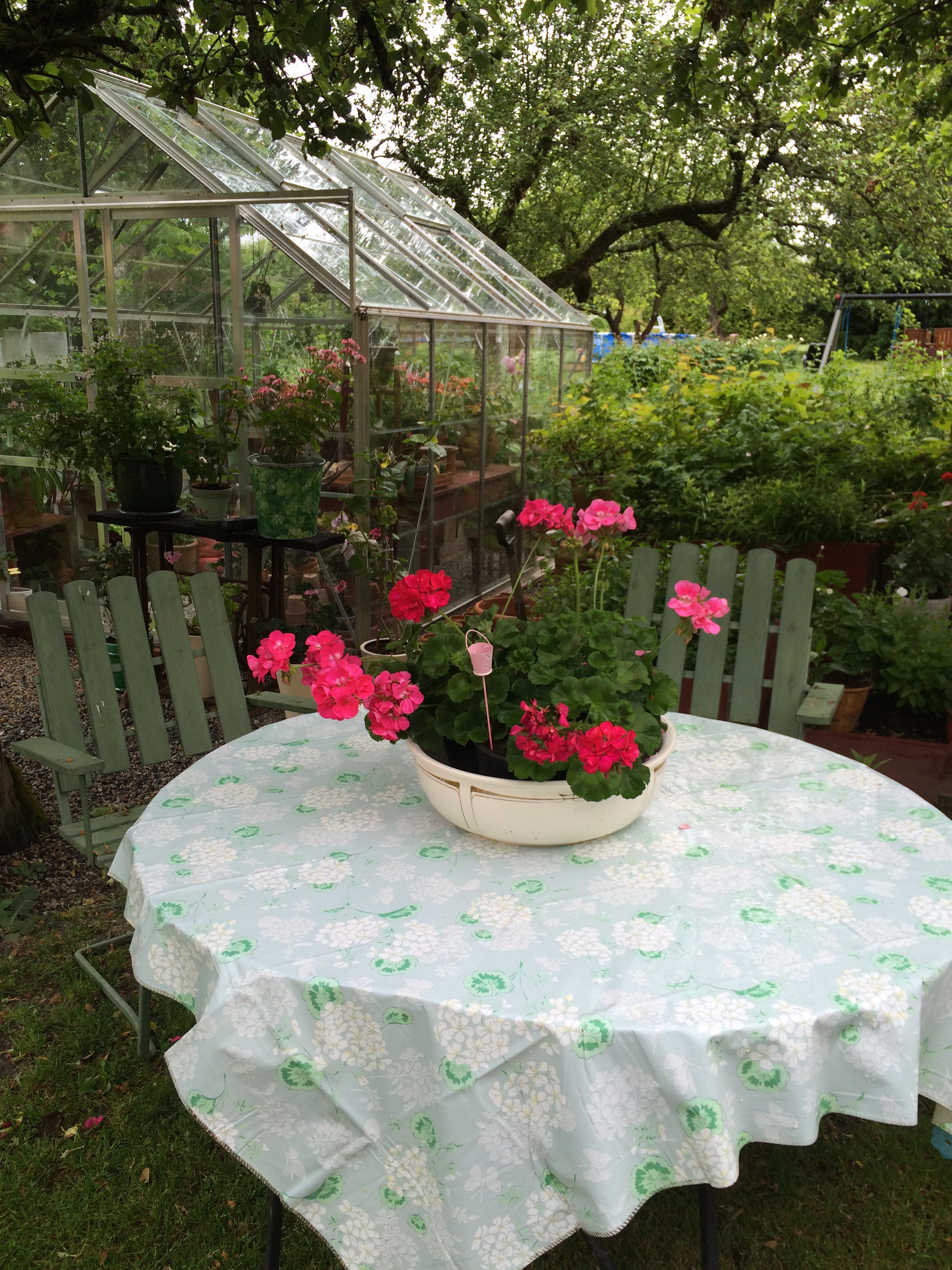 Nyinköpt gammal Grythyttan möbel från Sala silvergruvans antik blev skön under äppelträdet en varm dag,med en plastduk med vita pelargoner på från Rusta blev det kanon
