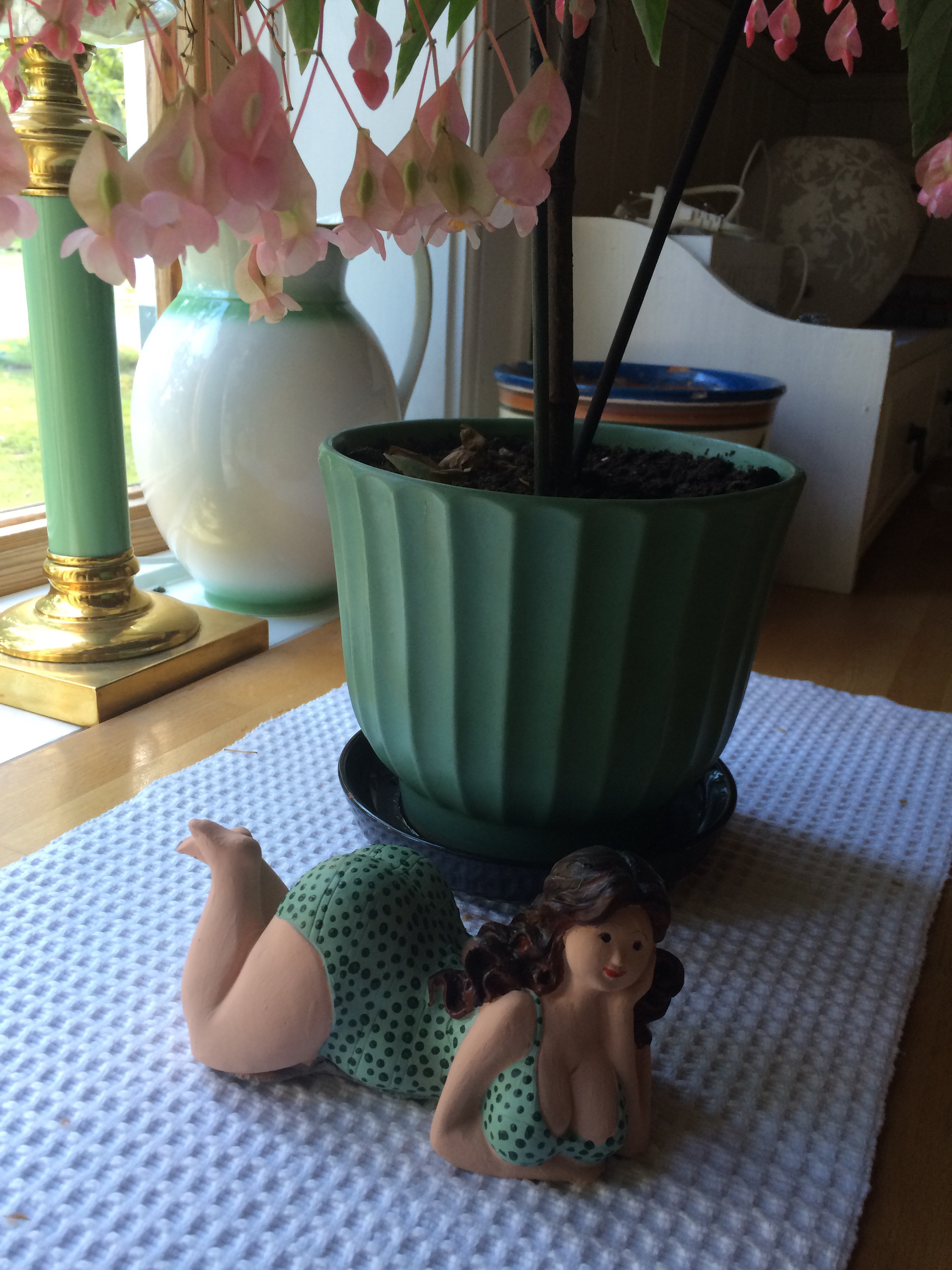 Lika glad är jag över min stora Tellus kruka,där min ängla vinge blommar så fint i,att sen min svägerska GunBrith har gjort o målat en häftig dam i samma färg,blev pricken över iet..