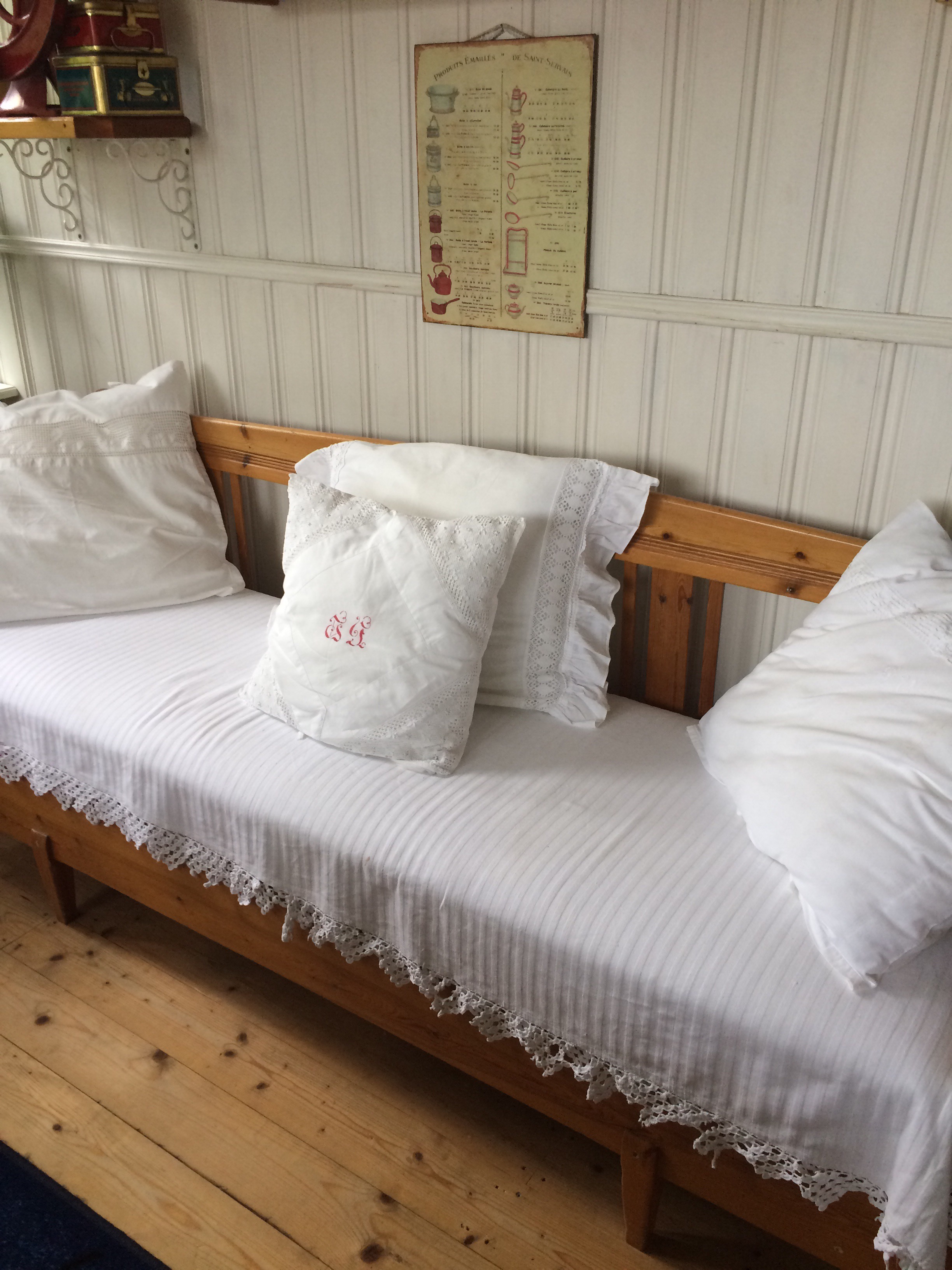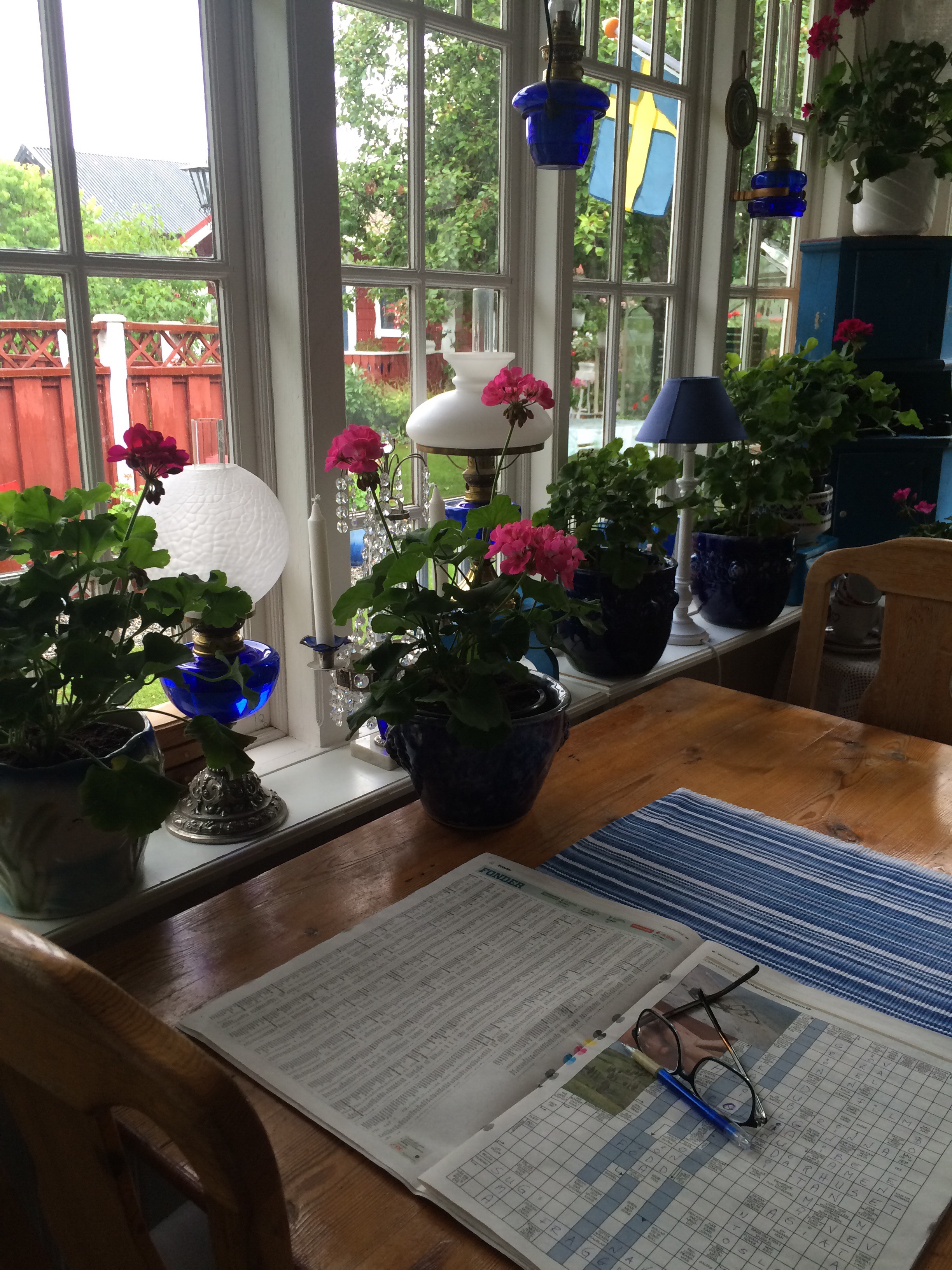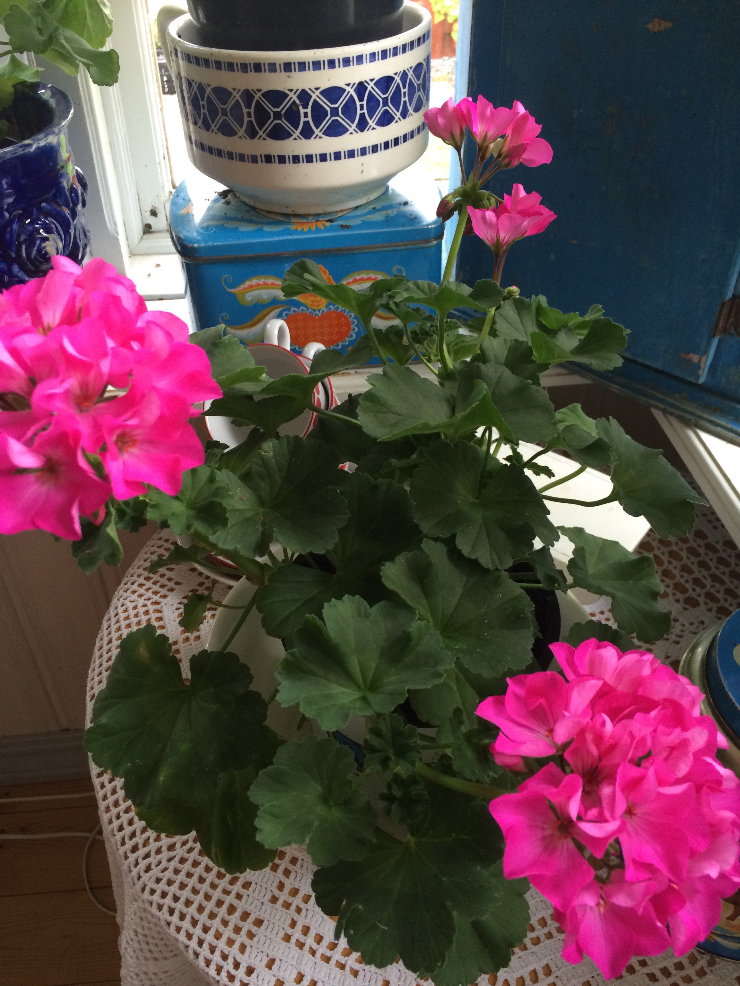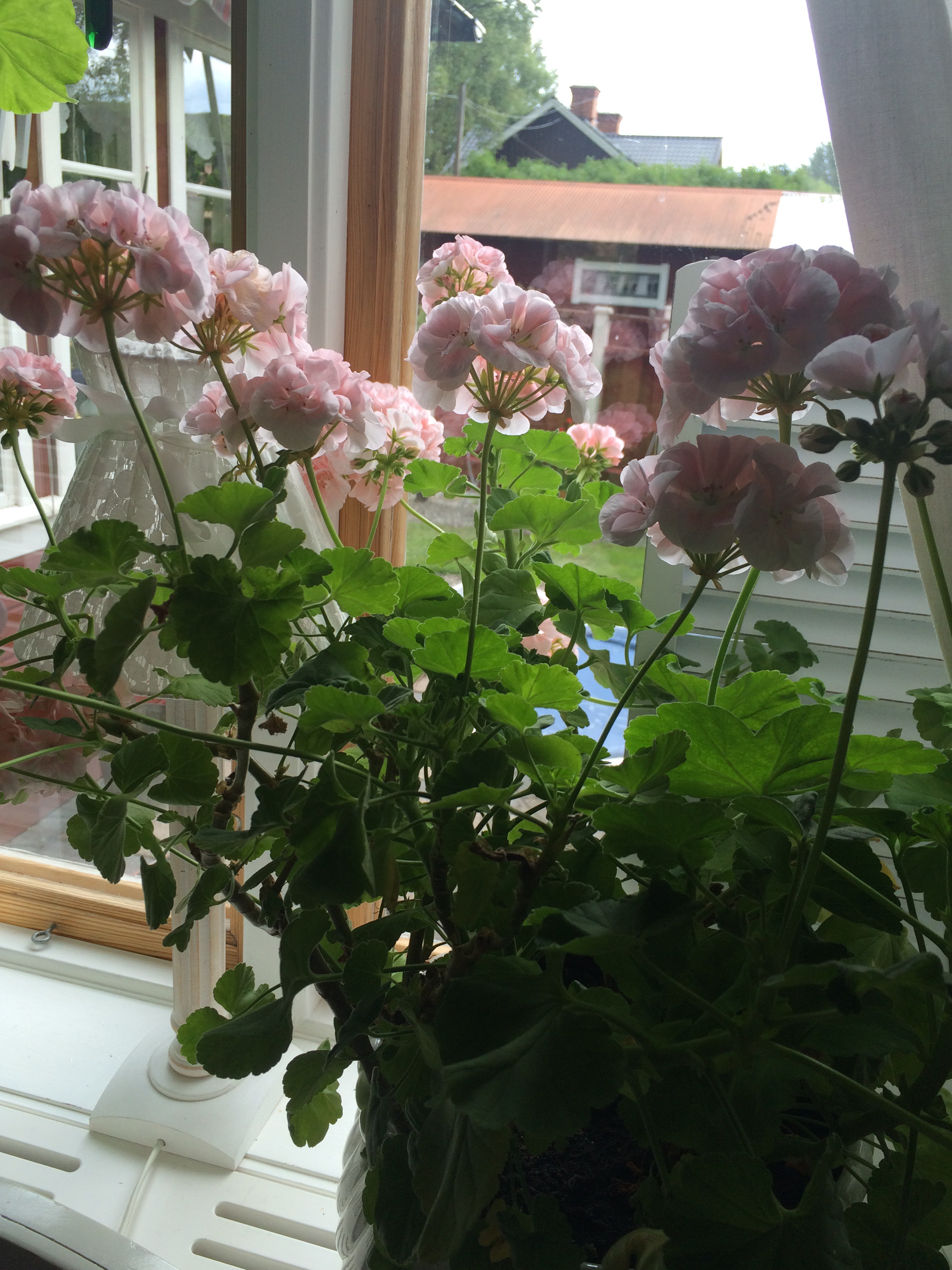 Men jag sitter ju inte i sjön,trots ösregn,sitter jag ganska behagligt i farmor/farfars gamla soffa o ärvda gamla örngott…o kolla på all Pelargoner på glasverandan..med