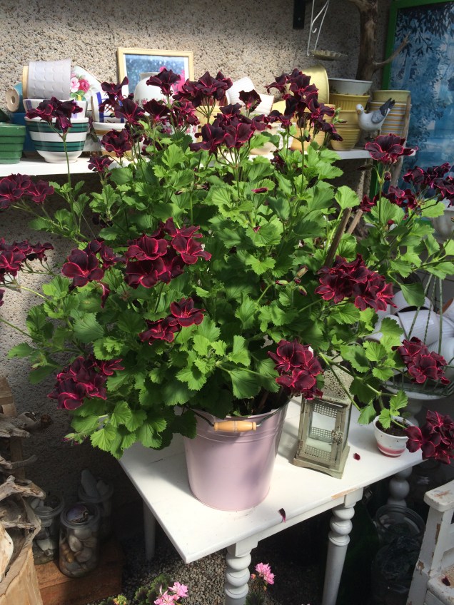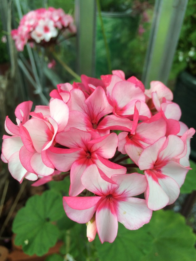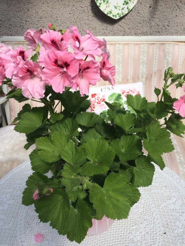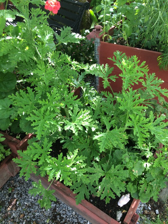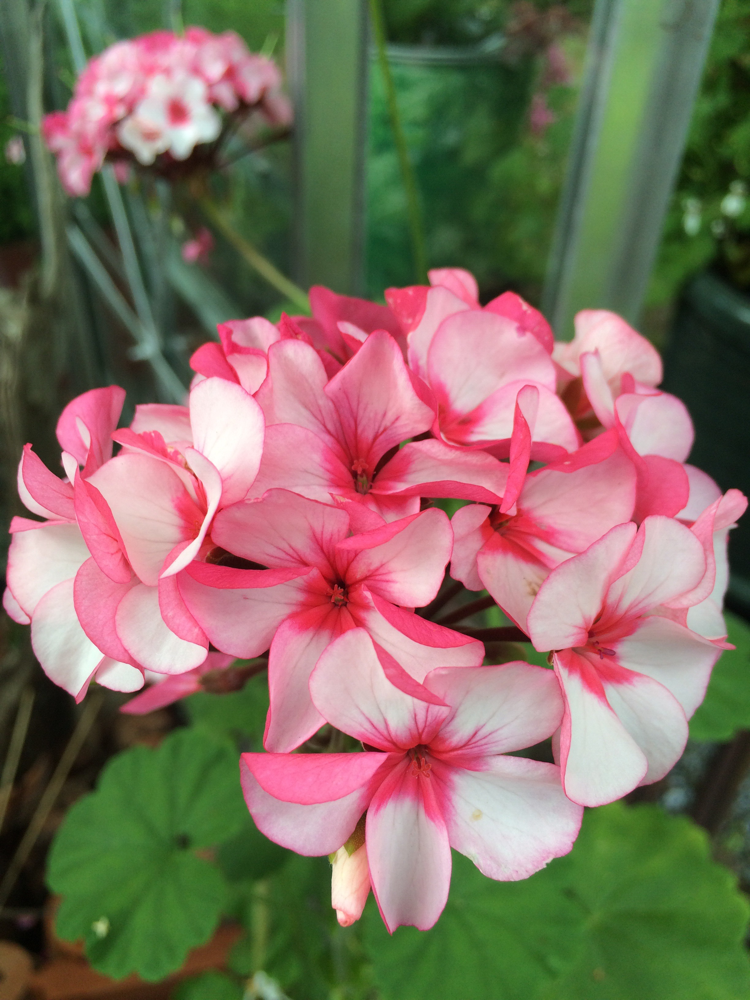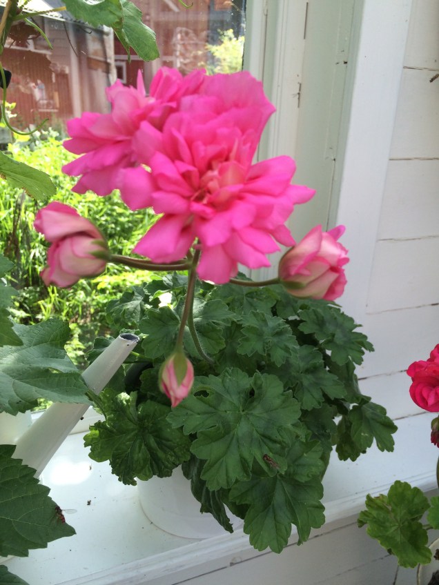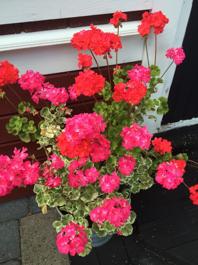 Röda Herrgårds pelargonen har inte riktigt bestämt sig om den vill vara röd eller rosa..hel gröna blad eller vit/gröna???