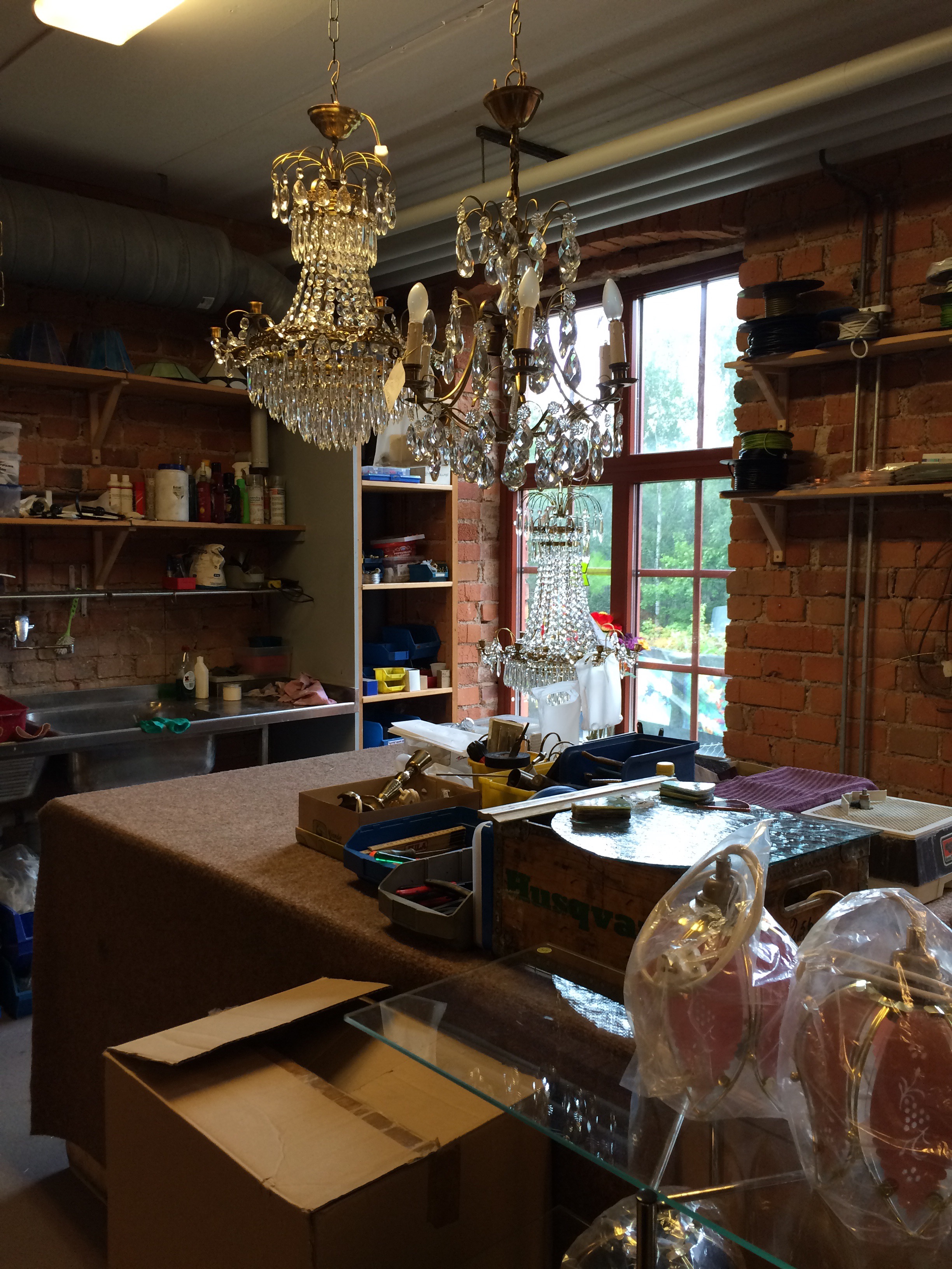 En inrednings butik med jättetrevlig tjej i kassan..ögat vill ha mycket🤓. Sedan in i nästa dörr o kolla på underbara kristallkronor som dom både lagar o tillverkar ,köpte oss en liren fönsterlampor i Tiffany stil som dom tillverkar i mängder av färger..