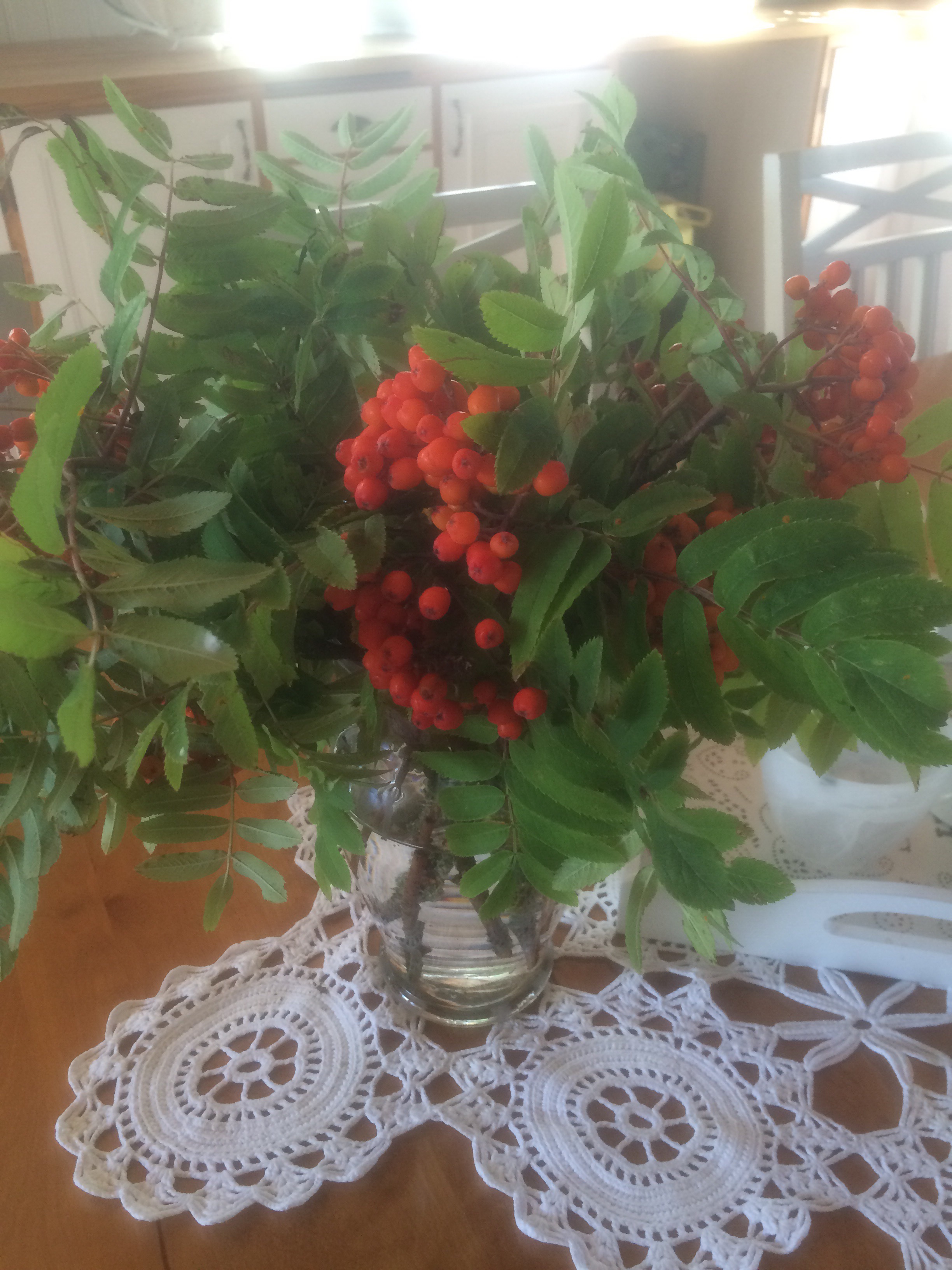 Väl hemma igen efter ca 40 mil i en inte alldeles för bekväm lastbil var jag tvungen ut på en promenad o röra på ben o rumpa,passade på att plocka årets första rönnbärs bukett som passar bra in i köket som fått sig lite höstfärger i det annars så vita inredningen ..