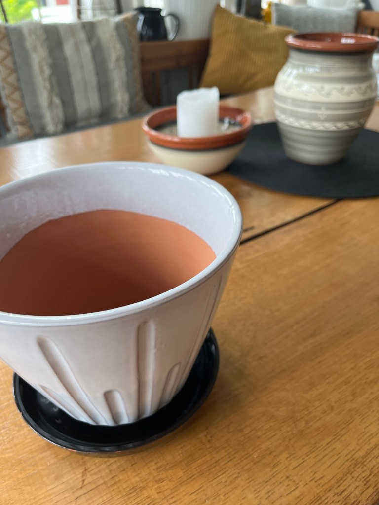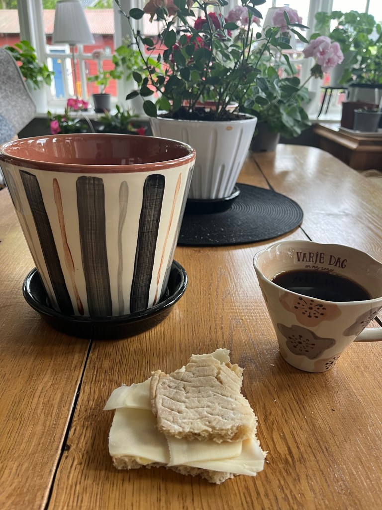 En morgon macka på verandan och ny kopp🩷vad mer kan man önska sig en ledig dag, den får stråla ihop med blomkrukorna från Nittsjö keramik , dessa heter Höst och finns i tre årstid varianter till, har 2 Höst men vill ha dom övriga också..